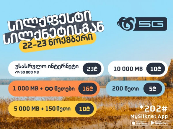 22 და 23 ნოემბერს, სილქნეტის აბონენტები გაიაქტიურებენ სილქფესტის შეთავაზებებს კოდით *202#, აპლიკაციით Mysilknet, ან პირდაპირ ვებ გვერდიდან: