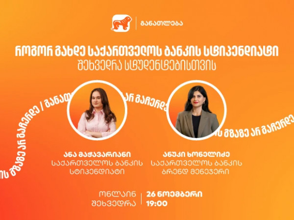 საქართველოს ბანკი, როგორც განათლების მთავარი მხარდამჭერი ბანკი, ნიჭიერი და მიზანდასახული სტუდენტებისთვის 21 პარტნიორ უნივერსიტეტში სასტიპენდიო პროგრამას ახორციელებს. თუ გსურს, გაიგო უფრო მეტი, თუ როგორ მოიპოვო საქართველოს ბანკის სტიპენდი და სრულად ან ნაწილობრივ დაიფინანსო სწავლა, დაესწარი ონლაინ ვებინარს – 26 ნოემბერს, 19:00 საათზე და დაუსვი კითხვები საქართველოს ბანკის სტიპენდიატს - ანა მაჭავარიანს და საქართველოს ბანკის ბრენდ მენეჯერს - ანუკი ხონელიძეს.