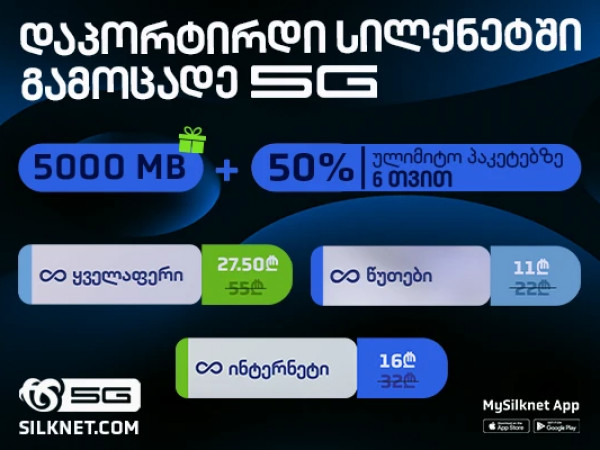სილქნეტის მობილურ ქსელში პორტირებისას მომხმარებელს საჩუქრად გაუაქტიურდება 5000 MB ინტერნეტი. ასევე აირჩევს ულიმიტო პაკეტებიდან სასურველს და 6 თვის განმავლობაში ისარგებლებს განახევრებული ტარიფით: