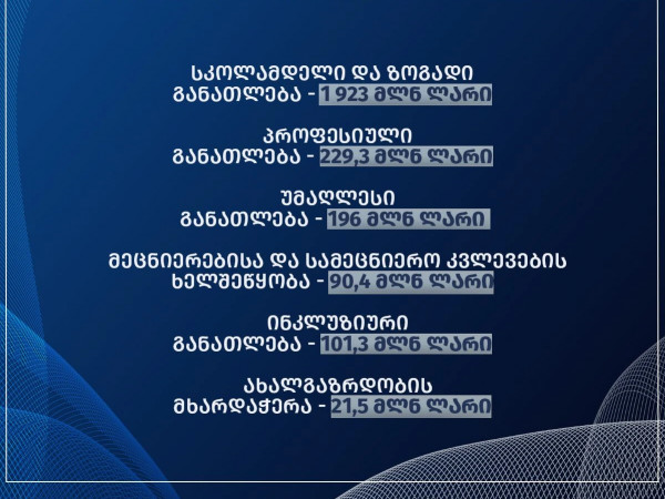 განათლების, მეცნიერებისა და ახალგაზრდობის სამინისტროს დაფინანსება პირველად პროექტთან შედარებით, 2026 წლის ბიუჯეტის საბოლოო ვარიანტში გაიზარდა, თითქმის, 90 მილიონი ლარით და 2 მილიარდ 700 მილიონ ლარს აჭარბებს.