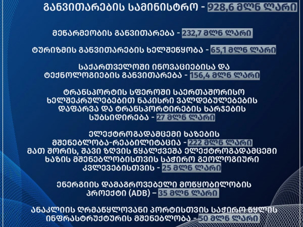 2026 წელს ეკონომიკისა და მდგრადი განვითარების სამინისტროსათვის გათვალისწინებულია 928 მილიონ ლარზე მეტი. პროექტის წინა ვერსიასთან შედარებით, სამინისტროს ფარგლებში ძირითადი ცვლილებები შემდეგია: