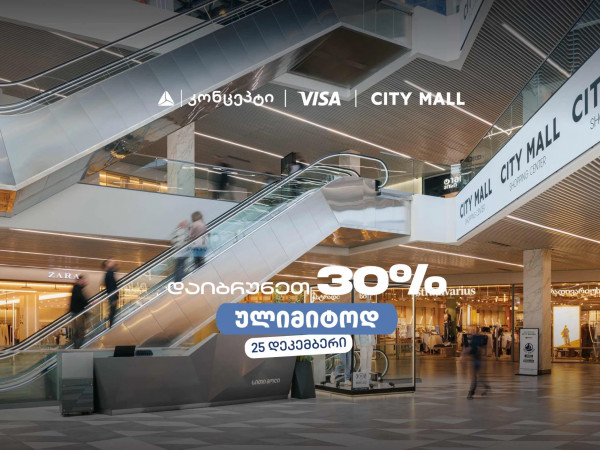 თიბისი კონცეპტმა მომხმარებელს ტრადიციულად განსაკუთრებული საახალწლო შეთავაზება მოუმზადა. მხოლოდ 25 დეკემბერს, თიბისი კონცეპტ Visa ბარათის მფლობელები, სითი მოლის შერჩეულ ობიექტებში 30%-ს ულიმიტოდ და მომენტალურად დაიბრუბენენ.