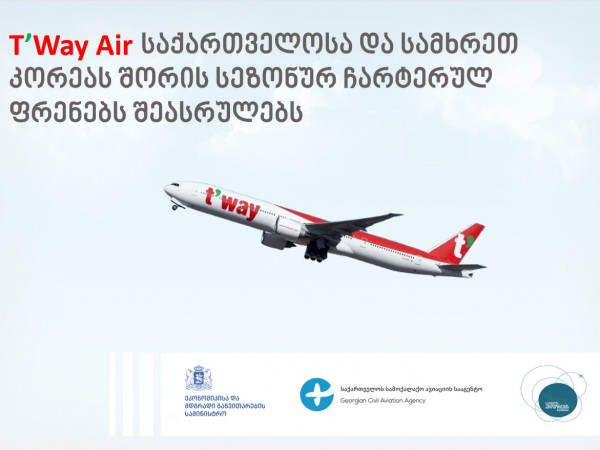 კორეის რესპუბლიკის წამყვანი დაბალბიუჯეტური ავიაკომპანია „T’way Air“-ი სეულსა და თბილისს შორის პირდაპირი არარეგულარული (ჩარტერული) ფრენების განხორციელებას გეგმავს.