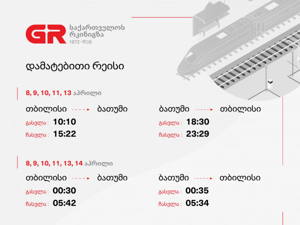 აღდგომის დღესასწაულთან დაკავშირებით, გაზრდილი მგზავრთნაკადის გამო, საქართველოს რკინიგზა 8 აპრილიდან 14 აპრილის ჩათვლით, თბილისი-ბათუმისა და თბილისი-ფოთის მიმართულებით მატარებლების რეისებს ამატებს.