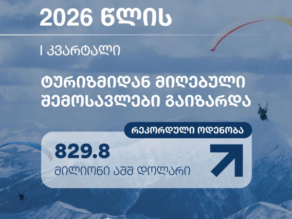 2026 წლის პირველ კვარტალში საერთაშორისო ტურიზმიდან მიღებული შემოსავლები 0.5%-ით გაიზარდა, კვარტალური რეკორდული მაჩვენებელი დაფიქსირდა და 829.8 მილიონი აშშ. დოლარი შეადგინა.