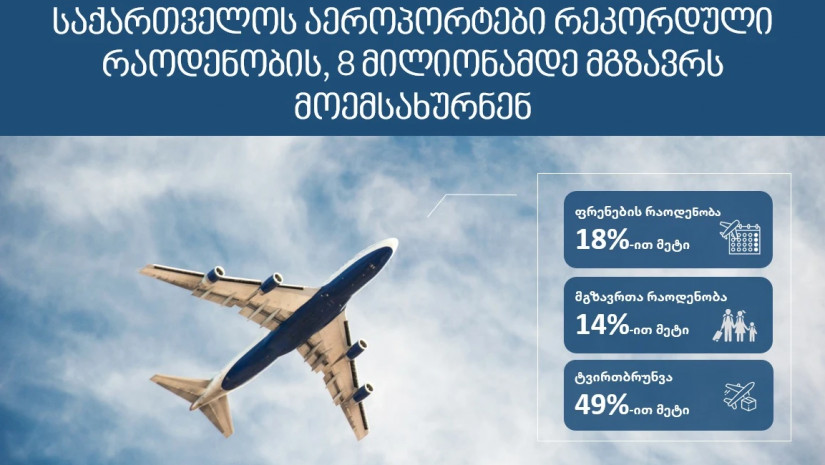 მიმდინარე წლის 11 თვის მონაცემებით, საქართველოს აეროპორტებში რეკორდული იყო როგორც მგზავრთნაკადი, ისე ფრენების რაოდენობა. იანვარ-ნოემბერში საქართველოს აეროპორტები 8 მლნ-მდე (7 863 534) მგზავრს მოემსახურნენ, რაც 2024 წლის ანალოგიურ პერიოდში არსებული მგზავრთნაკადის (6 908 493) რაოდენობას 14%-ით აღემატება. საანგარიშო პერიოდში განხორციელებული რეგულარული რეისების რაოდენობამ 26 855 ავიარეისი შეადგინა, ხოლო ჩარტერული ფრენების რაოდენობამ - 8 250. ჯამურად, 11 თვეში შესრულებული ავიარეისების რაოდენობა (35105) 18%-ით აღემატება 2024 წლის ანალოგიურ პერიოდში განხორციელებული ფრენების (29 871) რაოდენობას, რაც ასევე რეკორდული მაჩვენებელია.