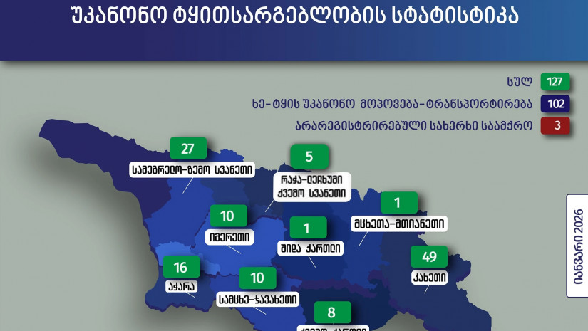 გარემოს დაცვისა და სოფლის მეურნეობის სამინისტროს გარემოსდაცვითი ზედამხედველობის დეპარტამენტის თანამშრომლებმა, 2026 წლის 01 იანვრიდან 31 იანვრის ჩათვლით პერიოდში, უკანონო ტყითსარგებლობის 127 ფაქტი გამოავლინეს.