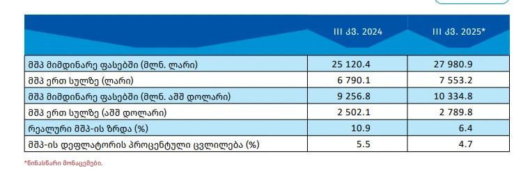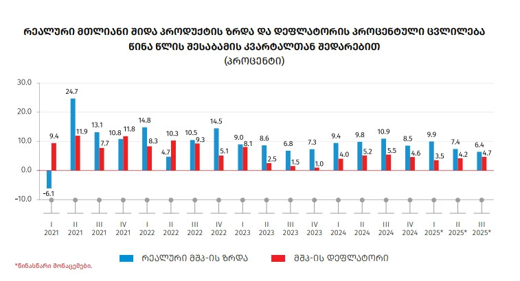 საქართველოს ეროვნული სტატისტიკის სამსახურის ინფორმაციით, 2025 წლის III კვარტალში მთლიანი შიდა პროდუქტის მოცულობა მიმდინარე ფასებში 27 980.9 მლნ. ლარს გაუტოლდა, ხოლო წინა წლის შესაბამის პერიოდთან შედარებით რეალური მთლიანი შიდა პროდუქტის ზრდამ 6.4 პროცენტი შეადგინა. მთლიანი შიდა პროდუქტის დეფლატორის პროცენტული ცვლილება 2025 წლის III კვარტალში 4.7 პროცენტით განისაზღვრა.