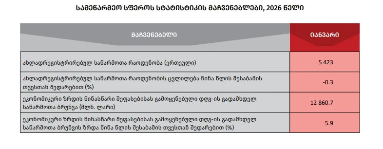 2026 წლის იანვარში, წინა წლის შესაბამის პერიოდთან შედარებით, ზრდის მიმართულებით მნიშვნელოვანი წვლილი შეიტანა შემდეგმა დარგებმა: ინფორმაცია და კომუნიკაცია, საფინანსო და სადაზღვევო საქმიანობები, სამთომოპოვებითი მრეწველობა, სასტუმროები და რესტორნები.
