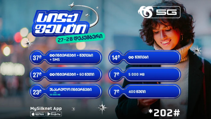 27 და 28 დეკემბერს, სილქფესტის აქციის ფარგლებში, აბონენტებს შესაძლებლობა ექნებათ ერთი და მეტი პაკეტი შეიძინონ Mysilknet აპლიკაციიდან, სილქნეტის ვებ გვერდიდან ან კოდით *202# . ამავე კოდით მსურველი გაუაქტიურებს ნებისმიერ პირობას სხვა ნომერსაც.