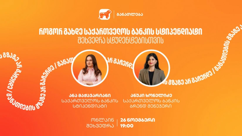 საქართველოს ბანკი, როგორც განათლების მთავარი მხარდამჭერი ბანკი, ნიჭიერი და მიზანდასახული სტუდენტებისთვის 21 პარტნიორ უნივერსიტეტში სასტიპენდიო პროგრამას ახორციელებს. თუ გსურს, გაიგო უფრო მეტი, თუ როგორ მოიპოვო საქართველოს ბანკის სტიპენდი და სრულად ან ნაწილობრივ დაიფინანსო სწავლა, დაესწარი ონლაინ ვებინარს – 26 ნოემბერს, 19:00 საათზე და დაუსვი კითხვები საქართველოს ბანკის სტიპენდიატს - ანა მაჭავარიანს და საქართველოს ბანკის ბრენდ მენეჯერს - ანუკი ხონელიძეს.