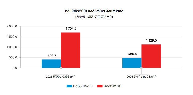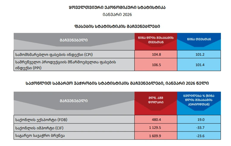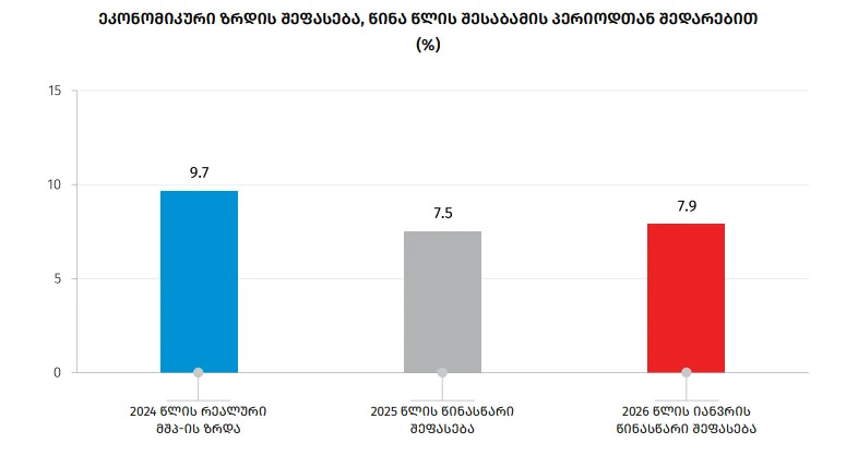 საქართველოს სტატისტიკის ეროვნული სამსახურის ინფორმაციით, წინასწარი შეფასებით, 2026 წლის იანვარში წინა წლის შესაბამის პერიოდთან შედარებით, რეალური მთლიანი შიდა პროდუქტის (მშპ) ზრდამ 7.9 პროცენტი შეადგინა.