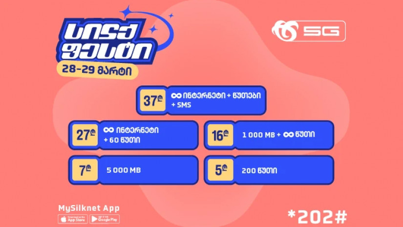 28-29 მარტს, აპლიკაციით MySilknet , კოდით *202# ან პირდაპირ ვებ გვერდიდან სილქნეტის მომხმარებელი სპეციალურ ფასად შეიძენს ერთ და მეტ პაკეტს სილქფესტის შეთავაზებიდან:
